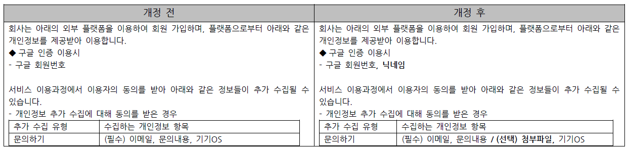 - 회사가 이용자로부터 수집하는 개인정보 항목을 현행화 하였습니다.
