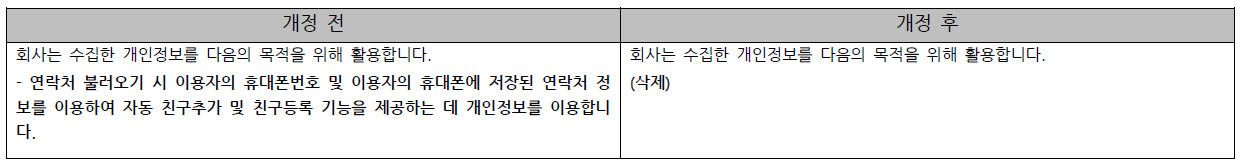 - 서비스를 하고 있지 않는 기능 관련 이용목적을 삭제하였습니다.